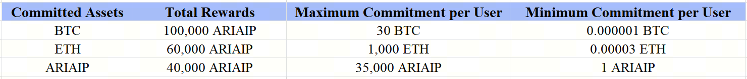 Eligible users can commit BTC, ETH or ARIAIP to earn a share of 200,000 ARIAIP tokens for free.